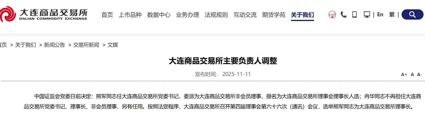大商所公告称,中国证监会党委日前决定:熊军任大商所党委书记,委派为大商所非会员理事,提名为大商所理事会理事长人选;冉华不再担任大商所党委书记、理事长、非会员理事,另有任用。