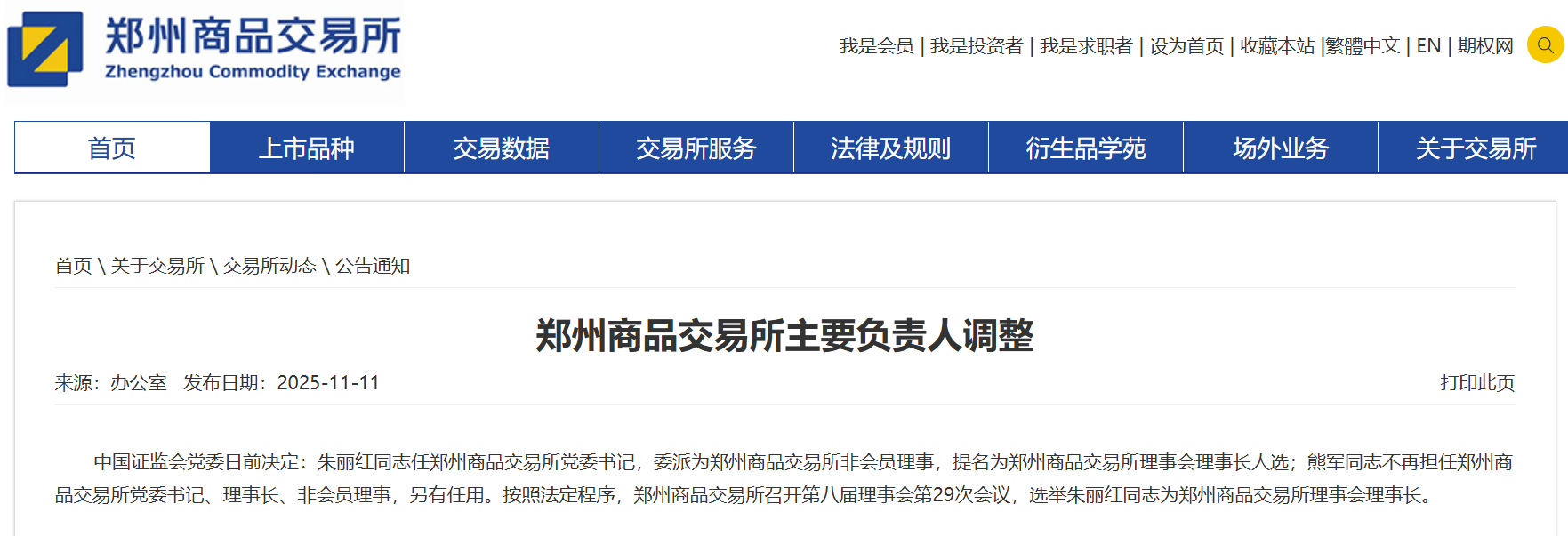 郑商所公告称,中国证监会党委日前决定:朱丽红任郑商所党委书记,委派为郑商所非会员理事,提名为郑商所理事会理事长人选;熊军不再担任郑商所党委书记、理事长、非会员理事,另有任用。