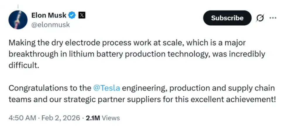 周一,马斯克在X上发帖向特斯拉工程师们在干电极(dry electrode)工艺上取得的成就表示祝贺:“实现干电极工艺的大规模应用,是锂电池生产技术的一项重大突破,但却极其困难。”